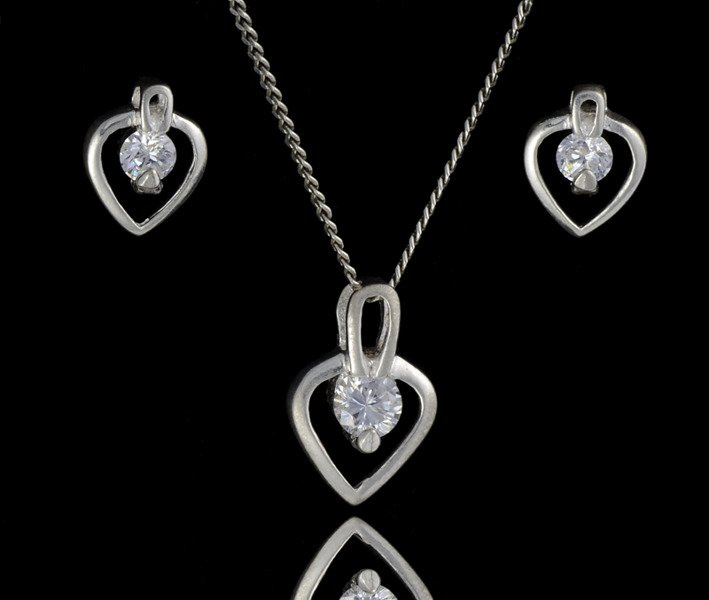 Komplet srebrny. Komplet składa się z kolczyków, wisiorka. W środku znajduje się duża, błyszcząca cyrkonia.