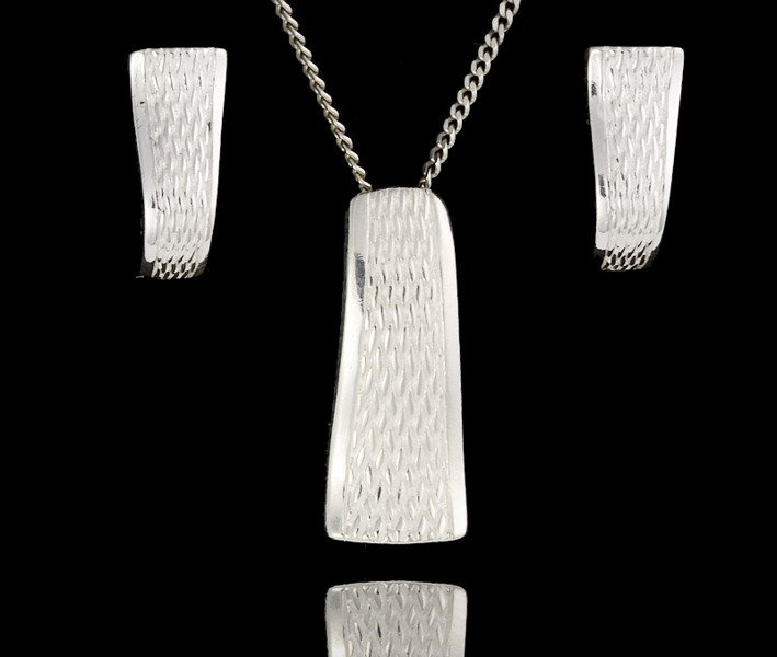 Komplet biżuterii o podłużnym kształcie. Komplet srebrny składający się z kolczyków, wisiorka.