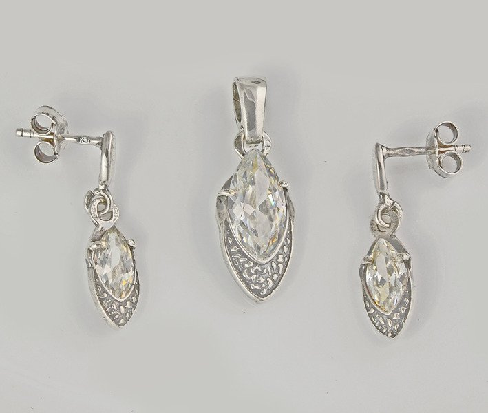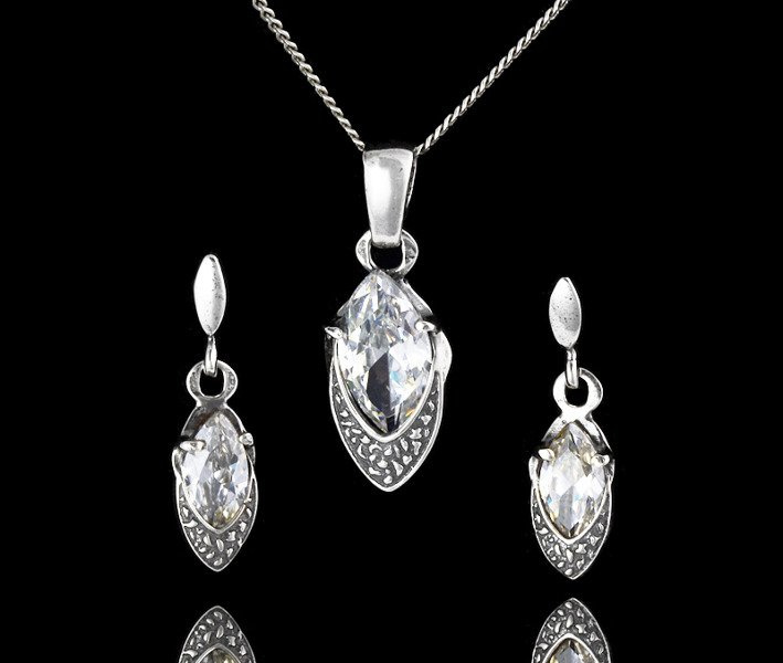 Komplet srebrny z cyrkonią w kształcie owalu. Komplet składa się z kolczyków, wisiorka. W środku znajduje się duża, błyszcząca cyrkonia.