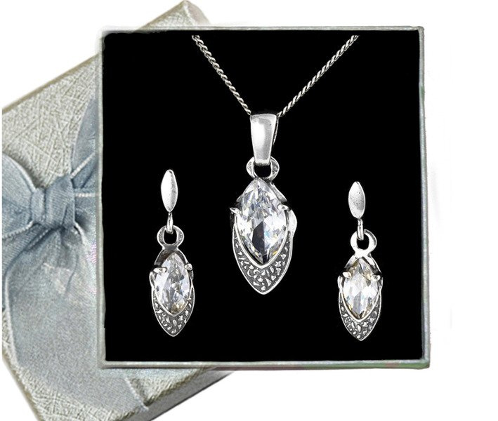 Komplet pakowany w srebrne pudełeczko z kokardką.