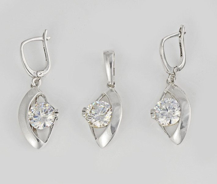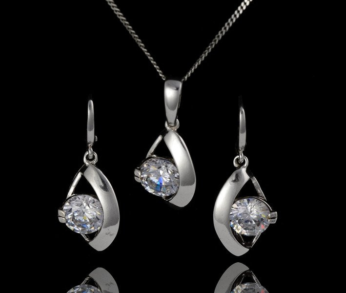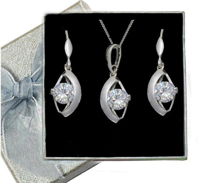 Komplet srebrny w kształcie owalu. Komplet składa się z kolczyków, wisiorka. W środku znajduje się duża, błyszcząca cyrkonia.