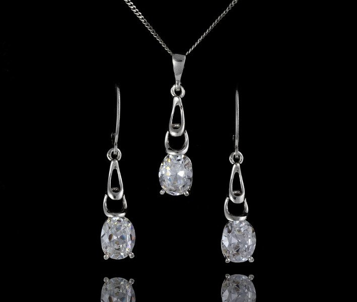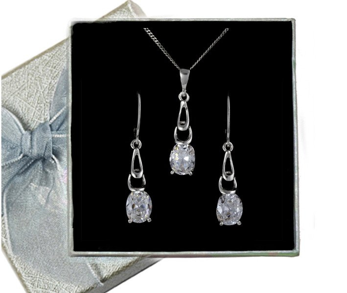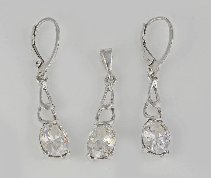 Komplet srebrny, podłużny. Komplet składa się z kolczyków, wisiorka. W środku znajduje się duża, błyszcząca cyrkonia.