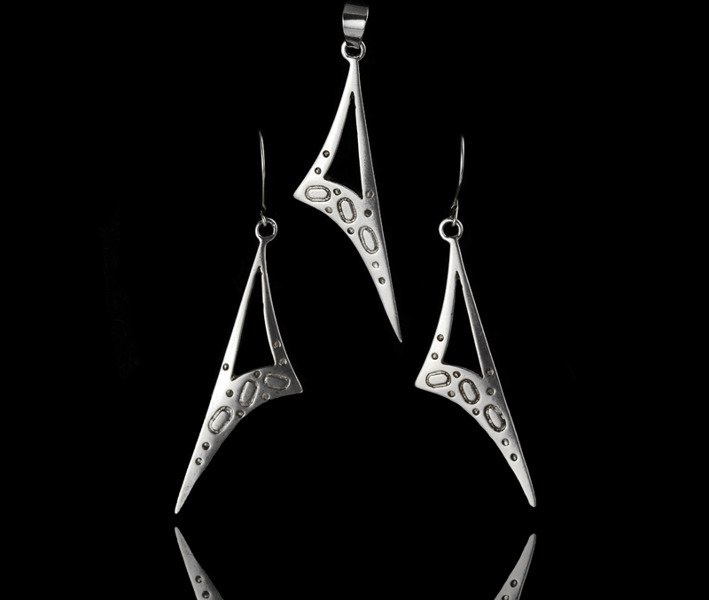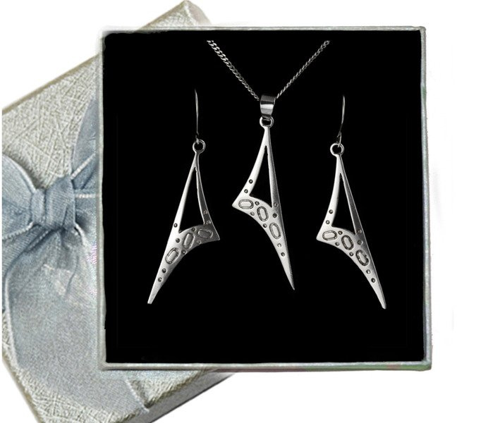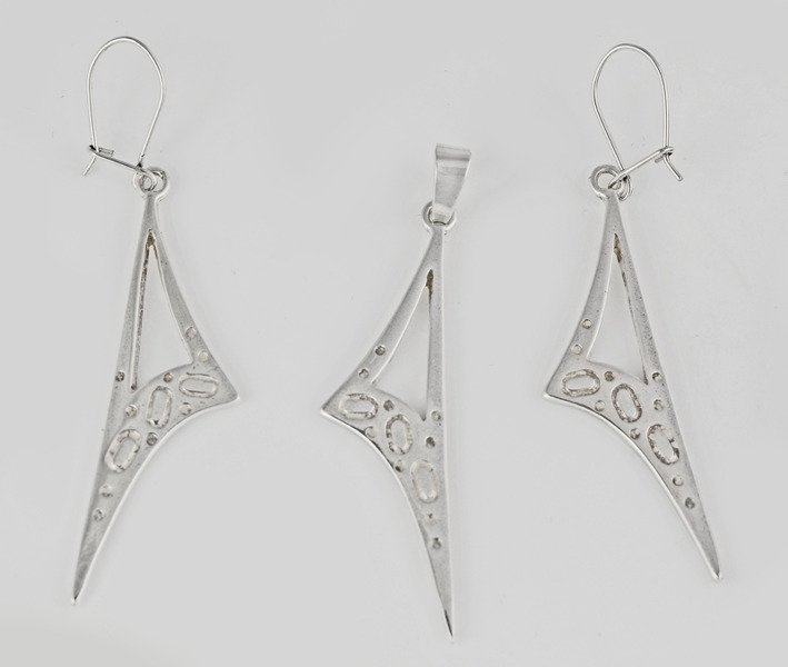 Komplet srebrny w kształcie trójkątów. Komplet składa się z kolczyków, wisiorka.