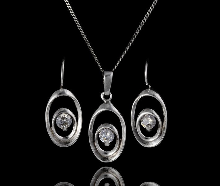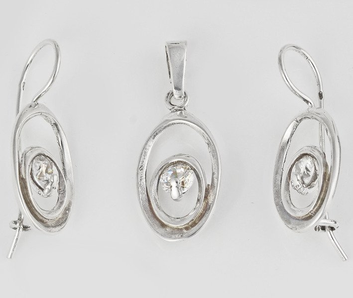 Komplet srebrny w owalnym kształcie. Komplet składa się z kolczyków, wisiorka. W środku znajduje się duża, błyszcząca cyrkonia.