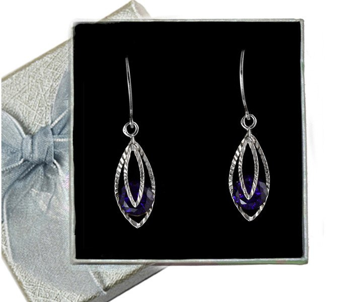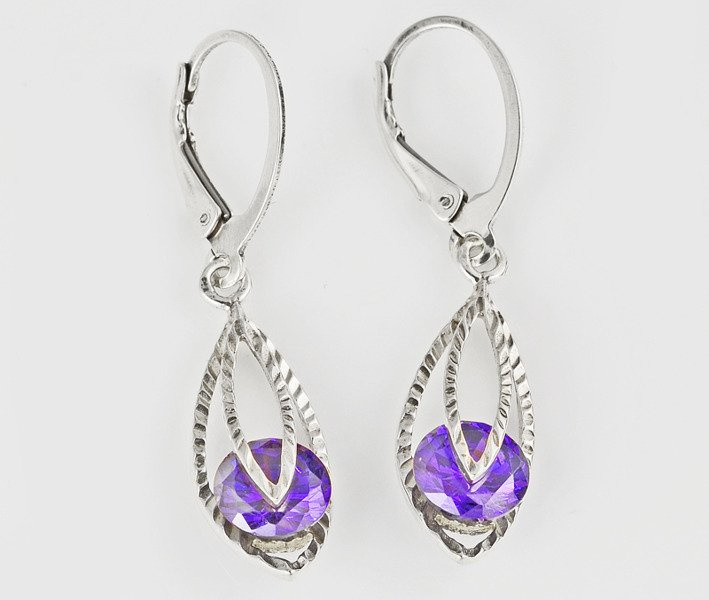Kolczyki srebrne w kształcie łez. W środku kolczyków znajduje się duża, fioletowa cyrkonia.