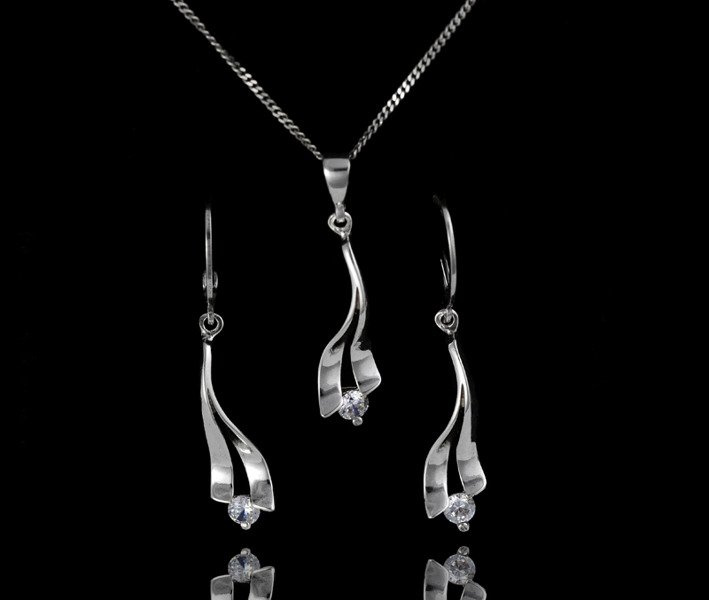 Komplet srebrny. Komplet składa się z kolczyków, wisiorka. W środku znajdują się błyszczące cyrkonie.