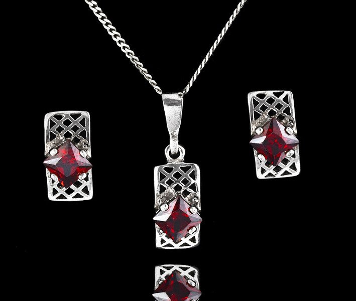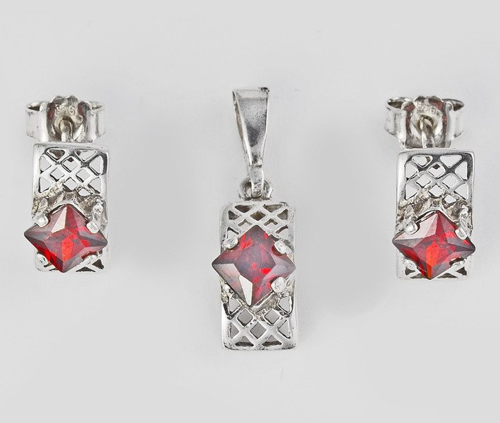 Komplet srebrny ażurowy. Komplet składa się z kolczyków, wisiorka. W środku znajduje się bordowa cyrkonia.