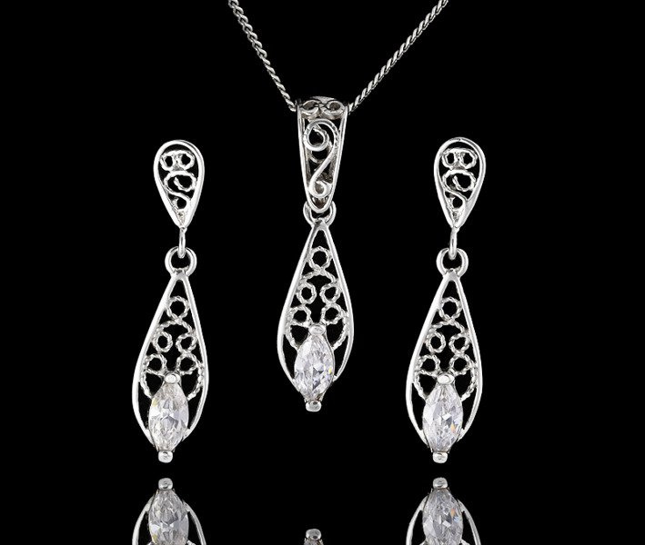 Komplet srebrny ażurowy. Komplet składa się z kolczyków, wisiorka. W środku znajduje się duża, błyszcząca cyrkonia.