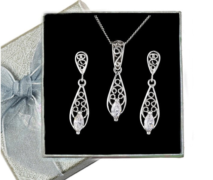 Komplet pakowany w  srebrne pudełeczko z kokardką.