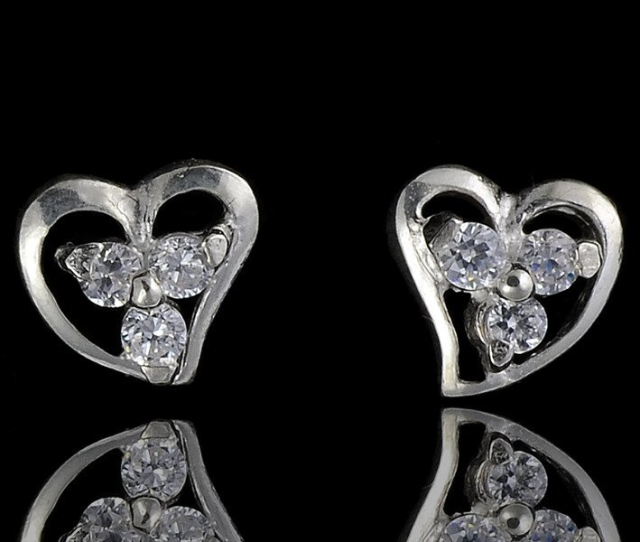 Kolczyki srebrne w kształcie serduszek. W środku kolczyków znajdują się błyszczące cyrkonie.