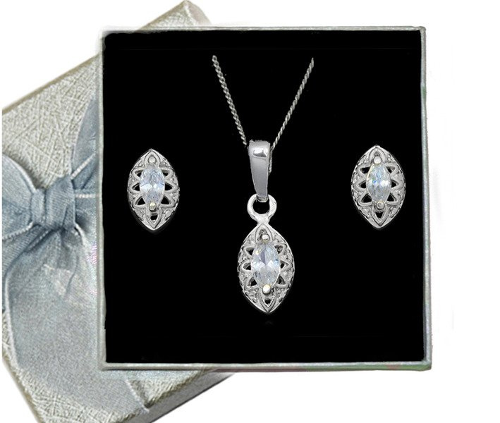 Komplet pakowany w srebrne pudełeczko z kokardką.