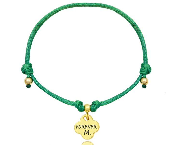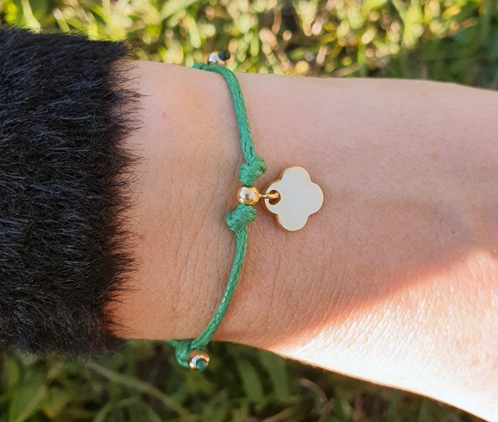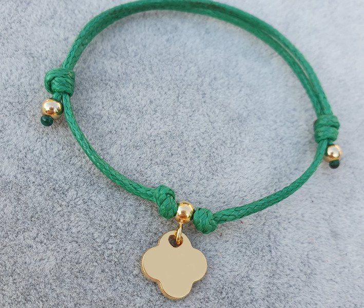 1102 BRANSOLETKA Z GRAWEREM złota koniczynka na sznureczku
