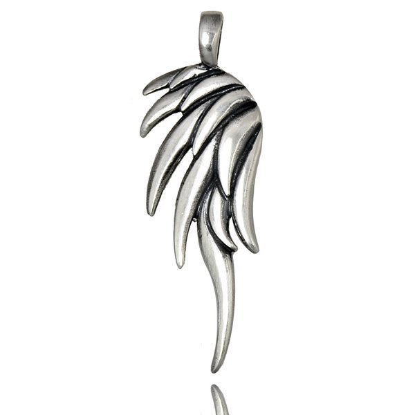 Elegancki wisiorek w kształcie skrzydła anioła. Wisiorek w całości srebrny, pokryty oksydą, dzięki czemu jest kolor jest ciemniejszy i posiada antyczny wygląd.