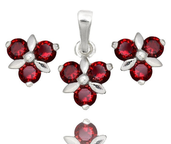 480/329 Komplet srebrny 925, kwiatuszki z cyrkonią czerwoną kolczyki, wisiorek .