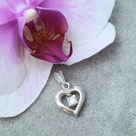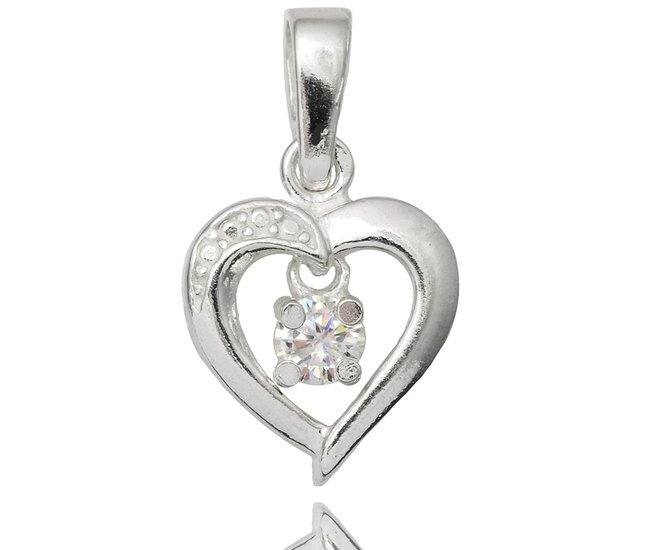 Srebrny wisiorek w kształcie serduszka. W środku serduszka znajduje się podwieszana cyrkonia.