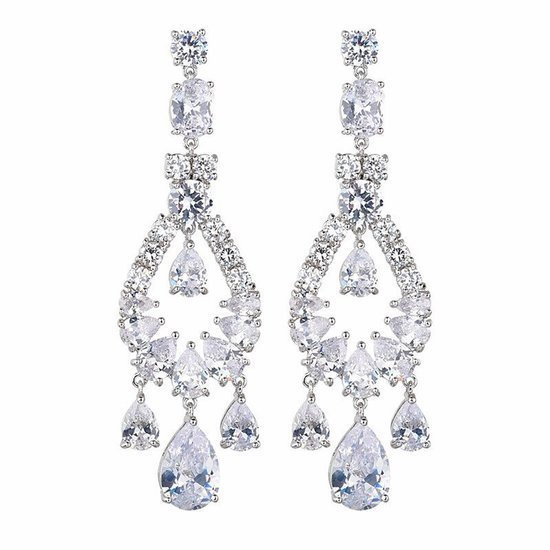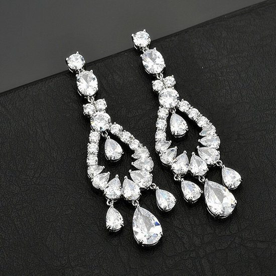 Proponujemy eleganckie kolczyki z podwieszanymi cyrkoniami w kształcie łezek.. Kolczyki świetnie sprawdzą się jako biżuteria ślubna.