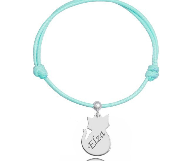 Przedstawiamy piękną bransoletkę z grawerem. Na sznureczku wisi zawieszka w kształcie kotka, na której wygrawerujemy dowolny tekst. Możliwość również wyboru innej zawieszki z paletki.