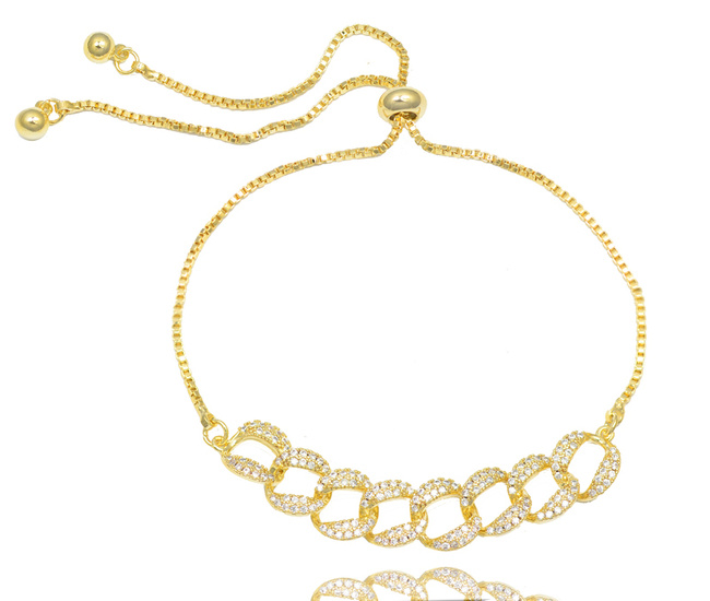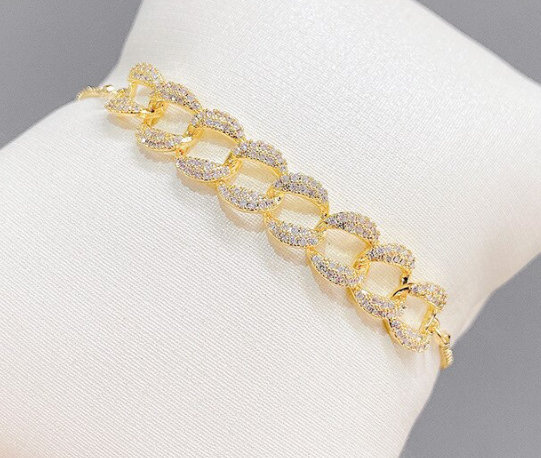 Pozłacana bransoletka z dużymi ogniwkami pokryta cyrkoniami. Modny kształt bransoletki będzie świetnym uzupełnieniem zarówno codziennej jak i wyjściowej stylizacji. Bransoletka wysokiej jakości z pewnością zaspokoi potrzeby najbardziej wymagającej klientki.