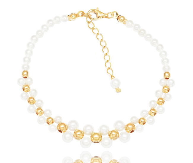 Przedmiotem oferty jest bransoletka srebrna 925 pozłacana z perełkami. Klasyczny design sprawi, że komplet będzie pasował kobiecie w każdym wieku, również świetnie sprawdzi się jako biżuteria ślubna.