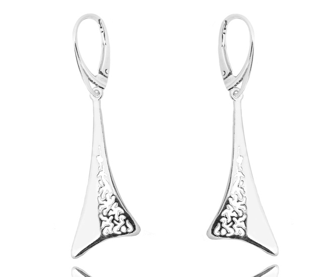 Kolczyki srebrne z finezyjnymi wzorkami ażurowymi.
