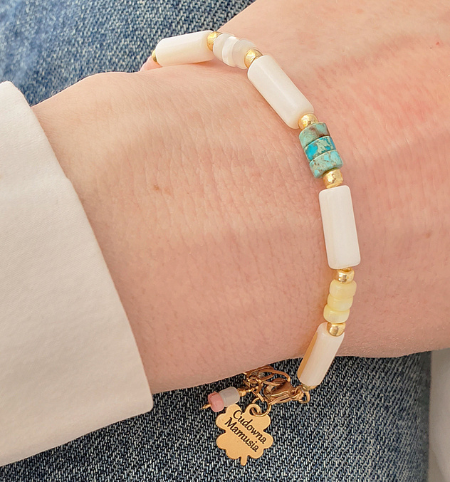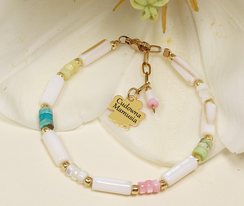 Delikatna bransoletka z pastelowymi kamieniami naturalnymi oraz zawieszką pod grawerunek.