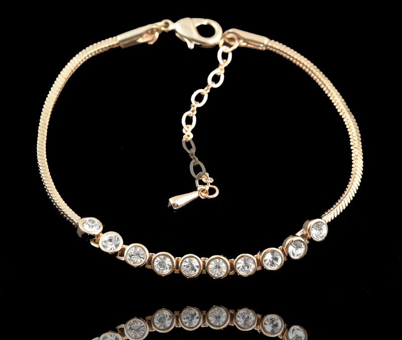 Bransoletka wysadzana drobnymi cyrkoniami. Odpowiednio szlifowane cyrkonie pięknie załamują światło i mienią się kolorami tęczy . Ciekawy kształt ozdobnych elementów będzie dobrze wpisywał się w elegancką kreację ślubną, outfit vintage czy wygodne codzienne ubranie.