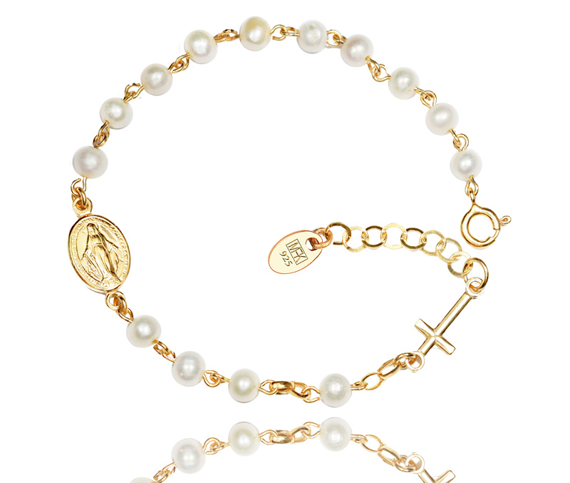 Przedmiotem oferty jest bransoletka różaniec z perełkami naturalnymi wykonana ze srebra pokrytego 24 karatowym złotem  .
