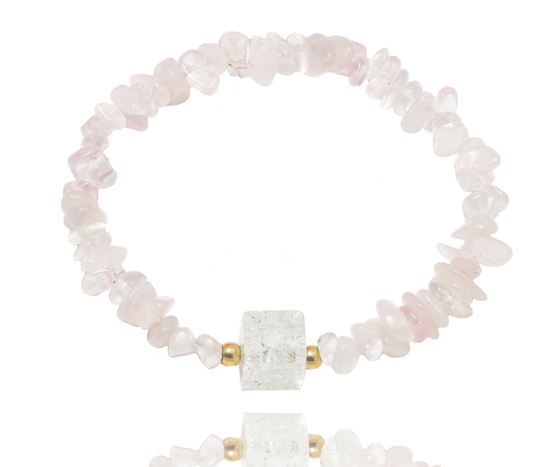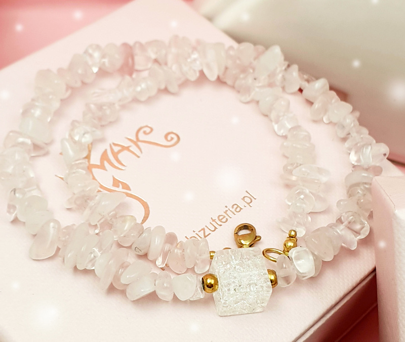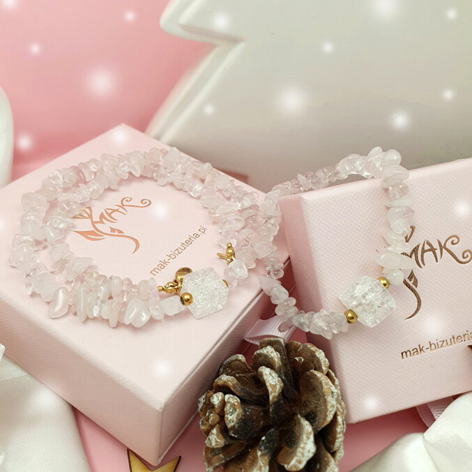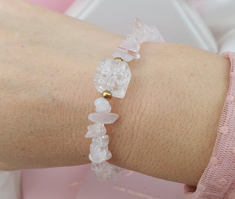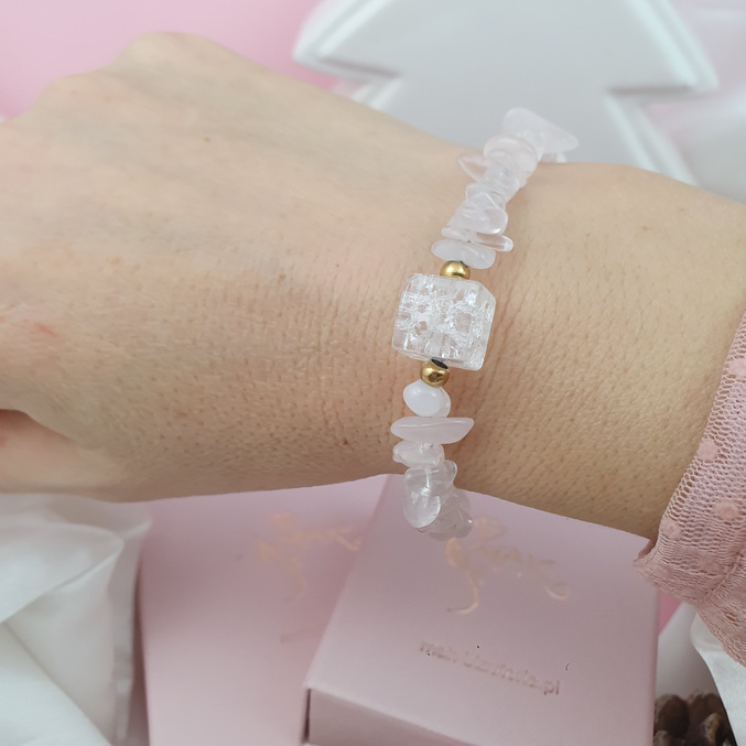 Bransoletka z kryształu górskiego z kolorze subtelnego różu z pokaźną kostką białą również z kryształu górskiego.