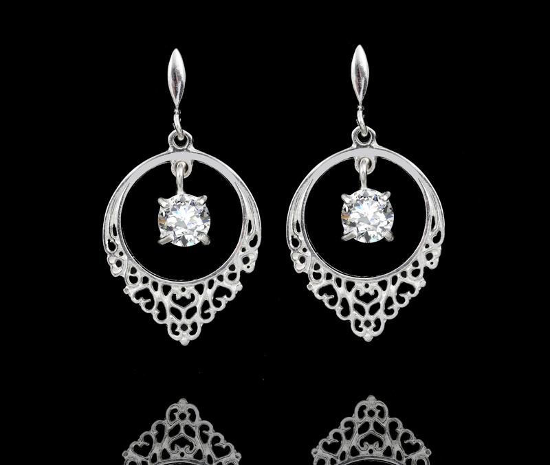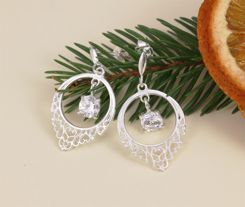 Kolczyki z cyrkonią i podwieszanym ażurowym ornamentem. Eleganckie kolczyki, lekkie lecz wyraziste, nie zostaną niezauważone. Będą świetnym uzupełnieniem Twojego looku.