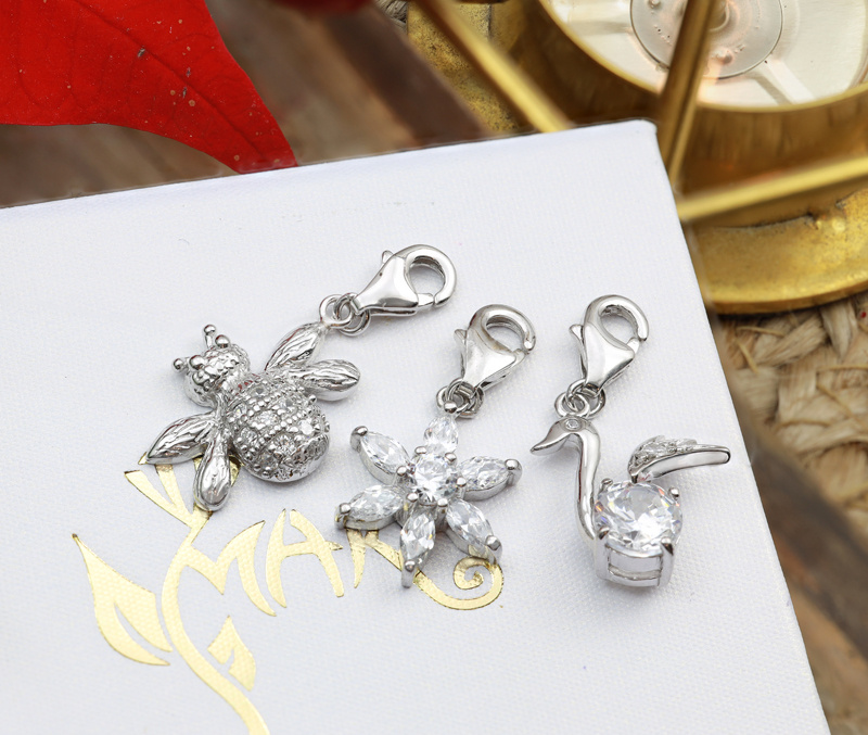 1596/9 srebro 925 komplet charms pszczoła, kwiat, łabędź