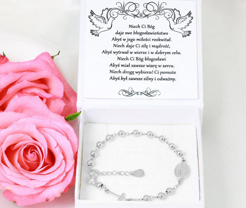 Piękny, srebrny różaniec jest idealnym prezentem na Pierwszą Komunię Świętą czy Bierzmowanie. W połączeniu z eleganckim pudełkiem z dedykacją stworzy niezapomniany upominek.