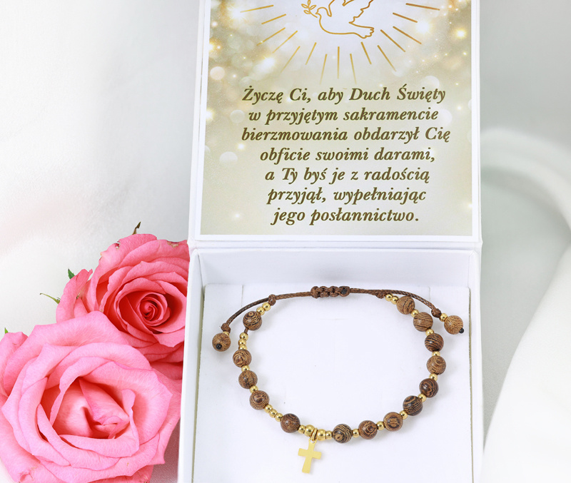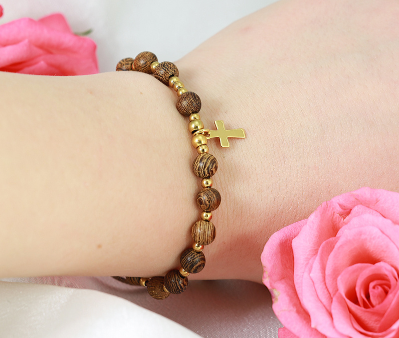1627/7 bransoletka różaniec stal złocona na sznureczku drewniane koraliki
