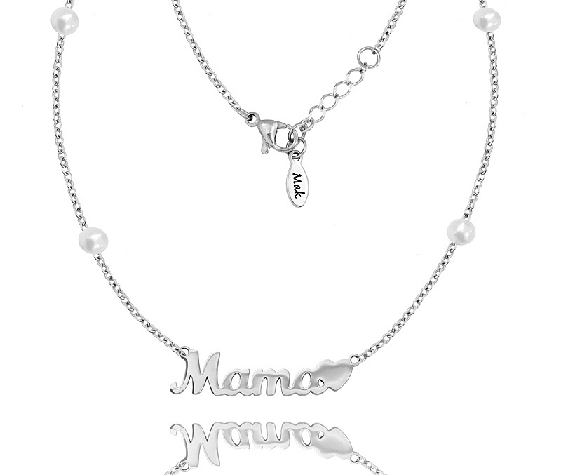 Naszyjnik srebrny z napisem mama oraz z perełkami naturalnymi o średnicy 5 mm.