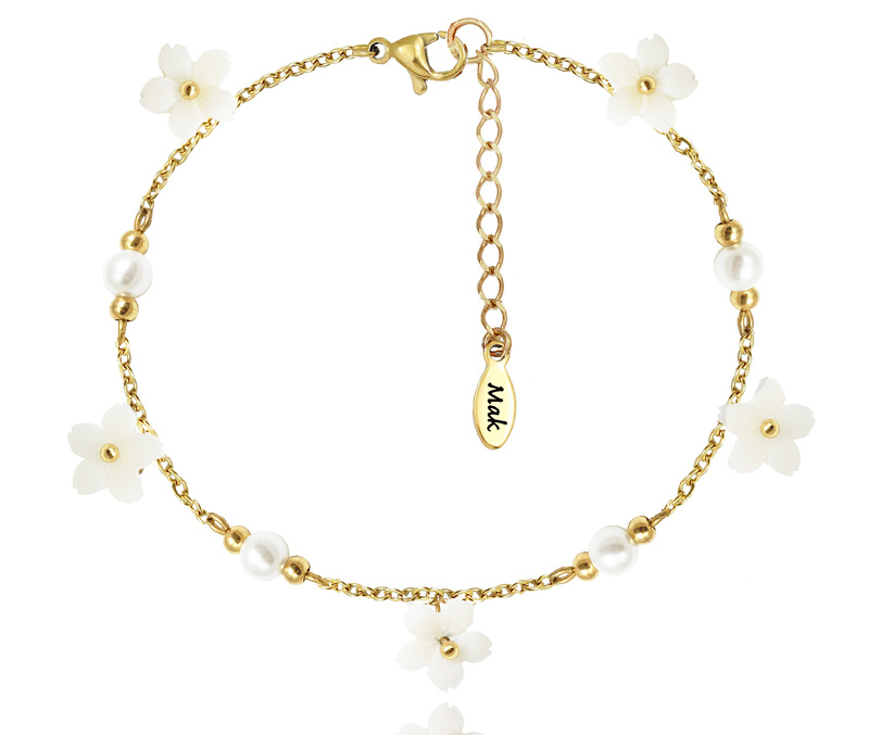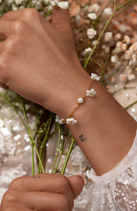 Przedmiotem oferty jest pozłacana bransoletka z perełkami i kwiatami