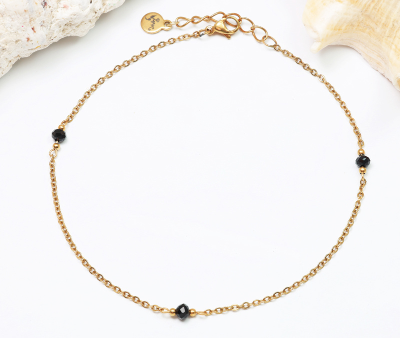 Ta delikatna bransoletka na stopę wykonana jest z pozłacanej stali, co nadaje jej elegancki i wyrafinowany wygląd. Na całej długości bransoletki rozmieszczone są czarne kryształki, które subtelnie zdobią i dodają lekkości projektowi. Bransoletka ta jest regulowana, dzięki czemu pasuje na różne rozmiary stóp i może być łatwo dopasowana do indywidualnych potrzeb użytkownika.