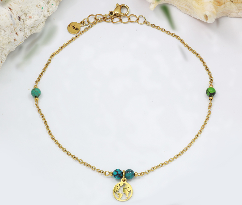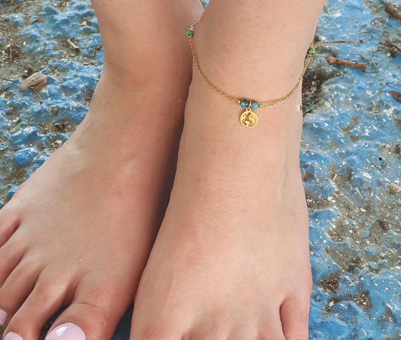 Oferujemy bransoletka na stopę z globusem oraz kamieniami naturalnymi. Wykonana jest na pozłacanym łańcuszku który dodaje całości blasku i delikatności. Bransoletka posiada regulowane zapięcie, które umożliwia dopasowanie jej długości do indywidualnych potrzeb.