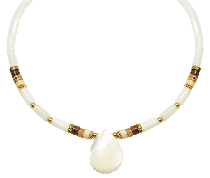 Ten naszyjnik wykonany jest z kamieni naturalnych, w tym wałków z masy perłowej oraz krążków jaspisu, co nadaje mu wyjątkowy i elegancki wygląd. Centralnym punktem jest duża kropla z masy perłowej, która przyciąga wzrok swoim delikatnym połyskiem. Krążki jaspisu, w odcieniach brązu i beżu, dodają naszyjnikowi ciepła i harmonii. Naszyjnik jest dodatkowo zdobiony małymi złocistymi przekładkami. Idealnie nadaje się na specjalne okazje lub jako elegancki dodatek do codziennych stylizacji.