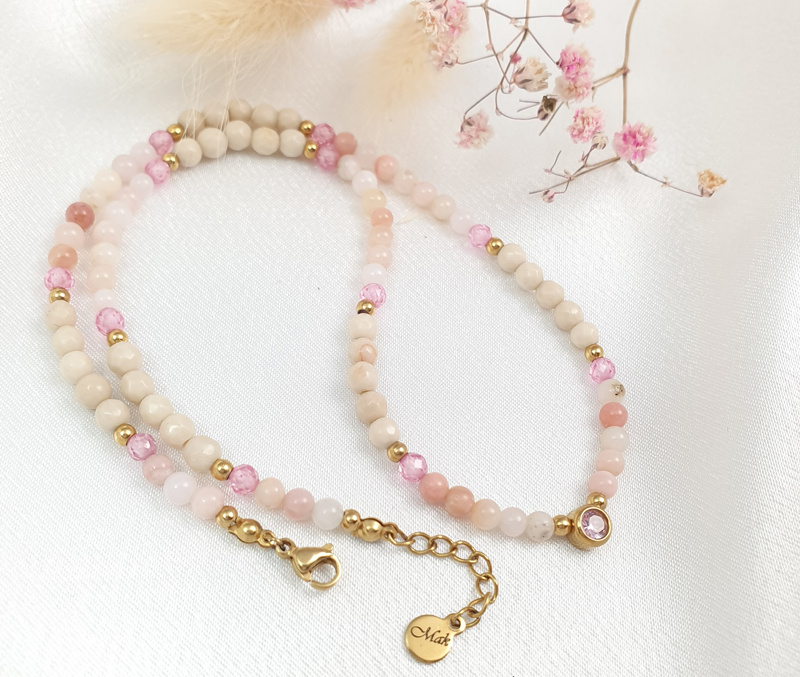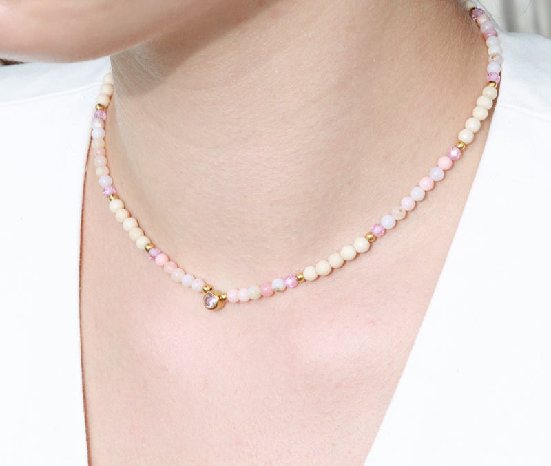 Naszyjnik wykonany z kamieni naturalnych w pastelowych odcieniach różu, beżu i kremu. Różowe cyrkonie dodają blasku i podkreślają kobiecy urok naszyjnika. To idealny dodatek do codziennych stylizacji, jak i na bardziej wyjątkowe okazje.