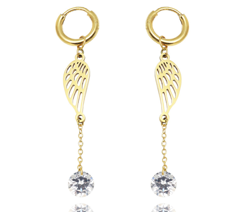 Te kolczyki wykonane są na pozłacanym łańcuszku ankier na którym umieszczono skrzydło oraz cyrkonię. Mogą być idealnym wyborem zarówno na eleganckie wyjścia, jak i na co dzień, dodając blasku każdej kreacji.