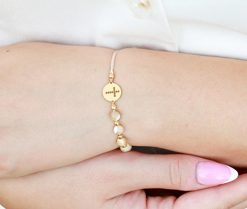 Ta bransoletka to elegancki i duchowy dodatek wykonany z wysokiej jakości materiałów. Głównym elementem bransoletki są koraliki z masy perłowej które w połączeniu z pozłacanymi kuleczkami pięknie łącza się w całość. Bransoletka jest wyposażona w regulowane zapięcie, co pozwala na dopasowanie jej do różnych rozmiarów nadgarstka. Wykonana z pozłacanego srebra próby 925, bransoletka jest nie tylko trwała, ale także odporna na codzienne zużycie, dzięki czemu będzie służyć przez długie lata. Taki dodatek doskonale sprawdzi się jako prezent na różne okazje, takie jak chrzest, komunia, czy inne ważne wydarzenia duchowe. Będzie także pięknym uzupełnieniem codziennej stylizacji, prezentując wartości chrześcijańskie.