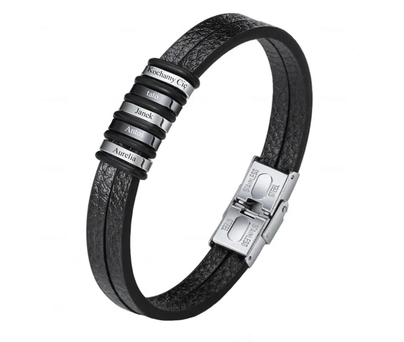 Przedmiotem oferty jest oryginalna bransoletka męska z grawerunkiem. Bransoletka składa się z dwóch gładkich rzemieni, do paseczków dołączonych 5 metalowych blaszek, na których wykonamy dowolny grawer.