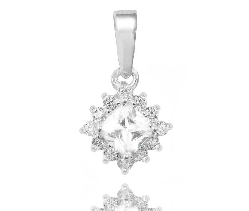 Przedmiotem oferty jest wisiorek w kształcie kwadratu, wykonany ze srebra 925. W środku wisiorka znajduje się duża cyrkonia, natomiast po małe białe co nadaje wszystkiemu elegancji i blasku.