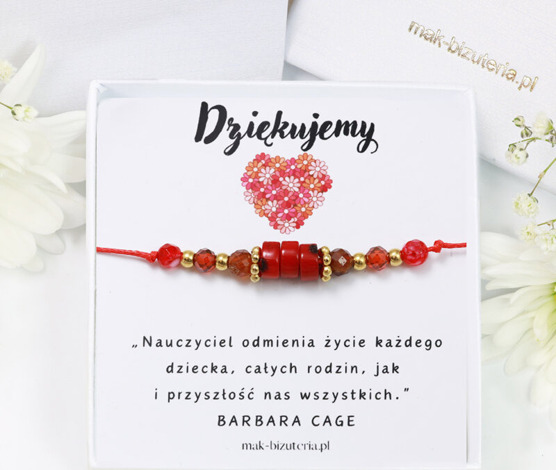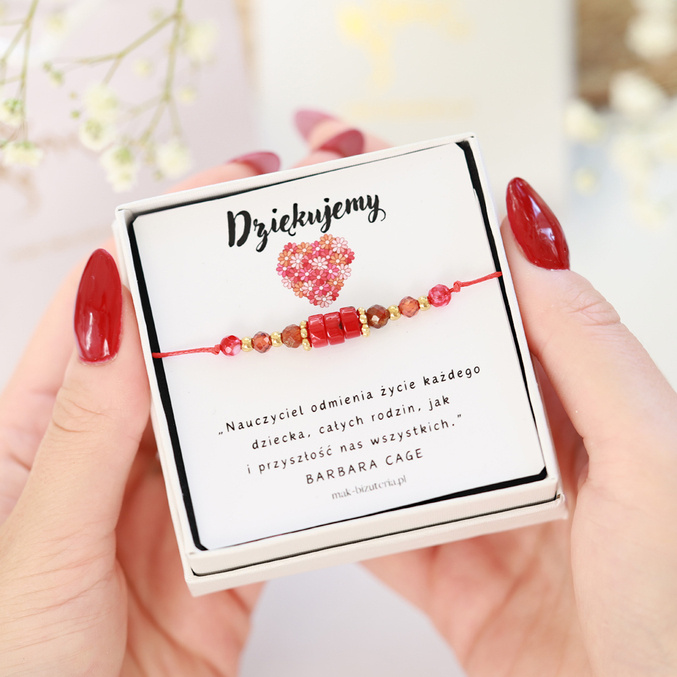 Przedmiotem oferty jest zestaw - pudełko z dedykacją wraz z bransoletką z kamieniami naturalnymi na sznureczku z płynną regulacją. Bransoletka będzie wyjątkowym upominkiem dla nauczyciela z okazji Dnia Nauczyciela lub zakończenia roku szkolnego. Kolor czerwony kamieni symbolizuje siłę władzy i zdolność do kierowania innymi. Tego typu upominek będzie wzruszającym gestem wdzięczności dla osób, które odgrywają ważną rolę w edukacji i rozwoju dzieci.