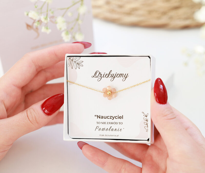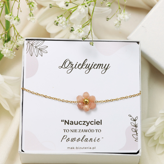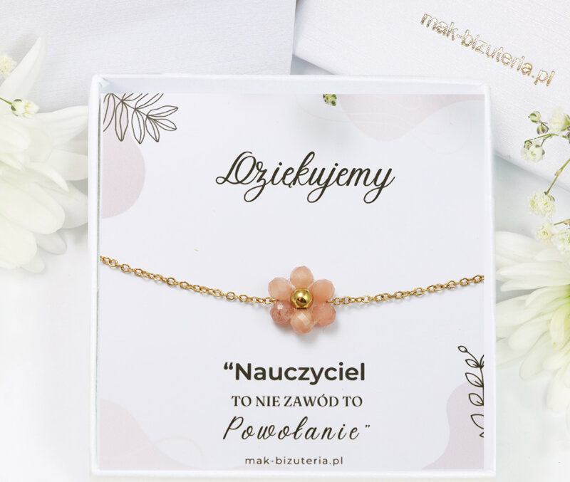 Przedmiotem oferty jest zestaw - pudełko z dedykacją wraz z bransoletką z kamieniami naturalnymi. Bransoletka będzie wyjątkowym upominkiem dla nauczyciela z okazji Dnia Nauczyciela lub zakończenia roku szkolnego. Bransoletka stworzona z kamieni naturalnych które układają się w kształt kwiatka, wraz ze złotymi dodatkami tworzy elegancką kompozycję. To nie tylko piękna biżuteria, ale też sentymentalny upominek, który będzie przypominać o klasie. Taki gest z pewnością będzie doceniony przez nauczyciela.