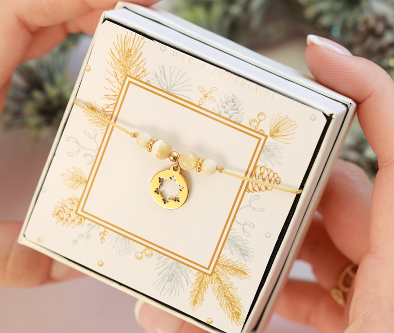 Przedmiotem oferty jest zestaw - pudełko z dedykacją wraz z bransoletką z masy perłowej z płynną regulacją. Bransoletka będzie wyjątkowym upominkiem dla bliskiej osoby z okazji Świąt Bożego Narodzenia lub Mikołaja. Delikatna kompozycja perłowych koralików i zawieszki śnieżynki będzie sprawiała, że bransoletka stanie się klasycznym dodatkiem, zarówno na co dzień jak i od święta.