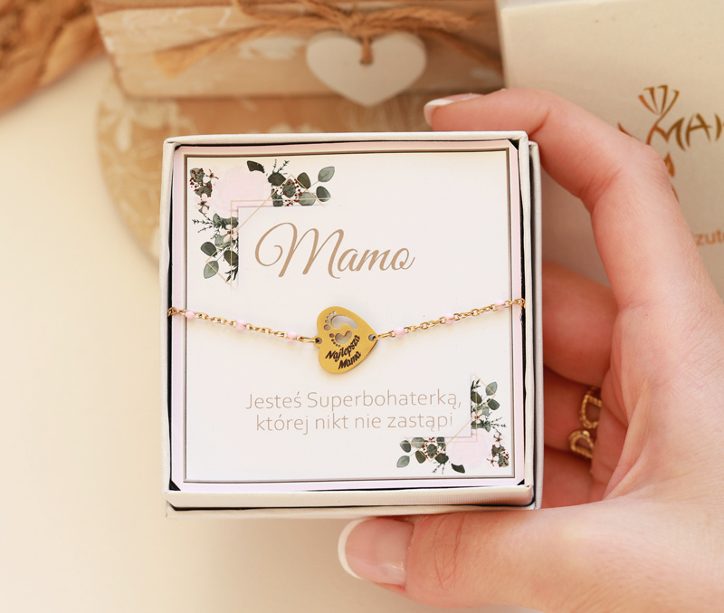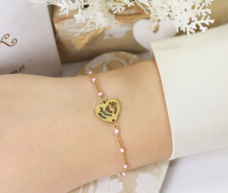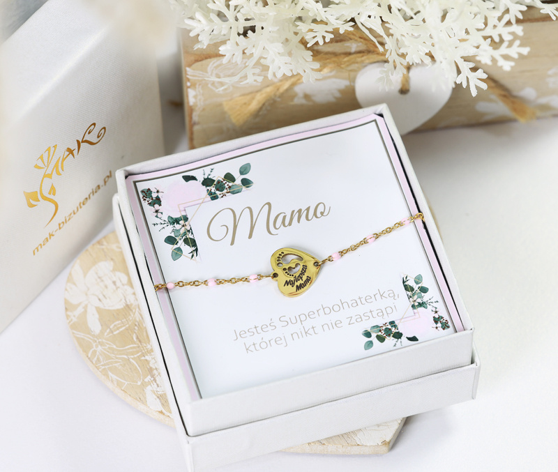 Przedmiotem oferty jest zestaw - pudełko z dedykacją wraz z bransoletką zdobioną emalią. Bransoletka będzie wyjątkowym upominkiem dla mamy z okazji Dnia Matki bądź świąt. Delikatna kompozycja łańcuszka w odcieniu różu ze złoconym sercem, będzie sprawiała, że bransoletka stanie się klasycznym dodatkiem, zarówno na co dzień jak i od święta.