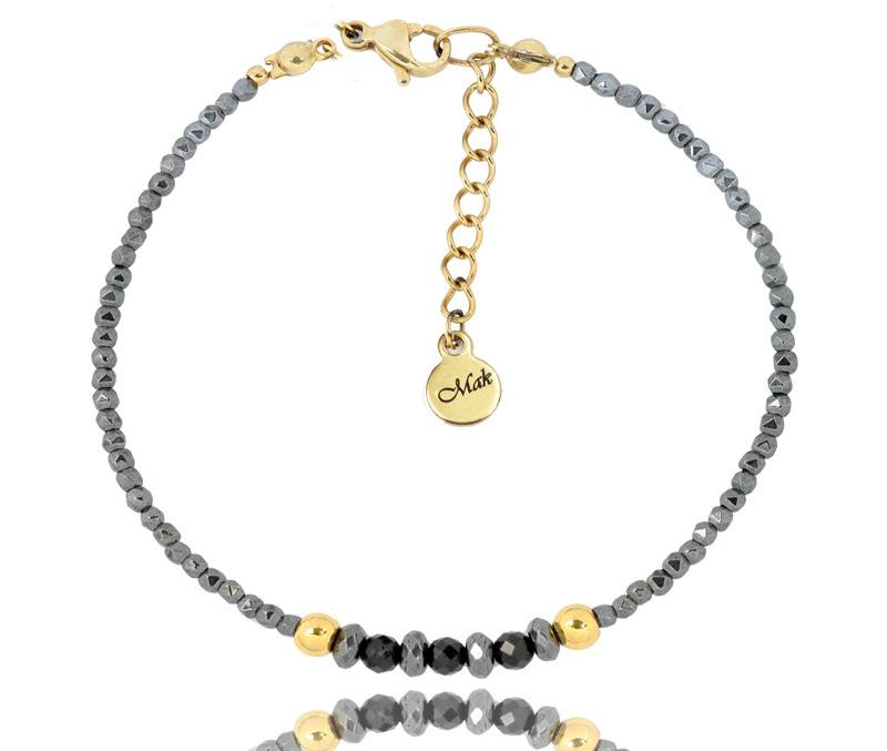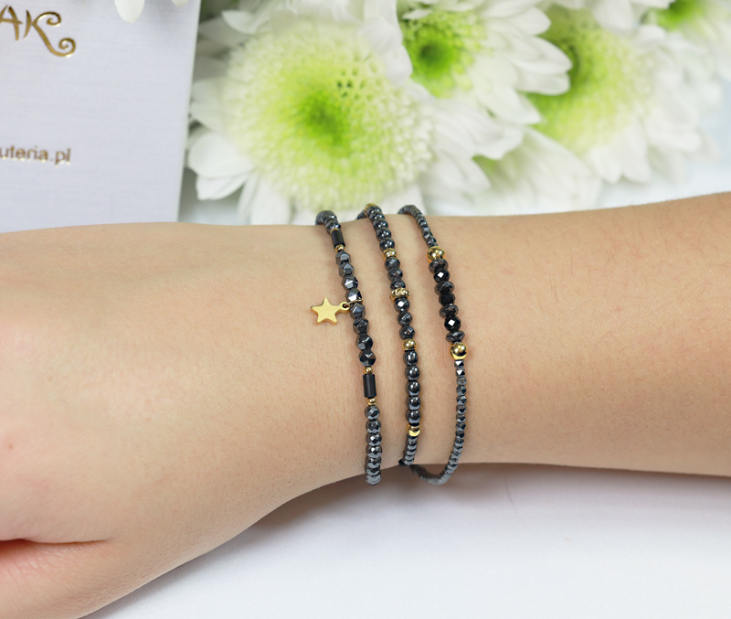 Przedstawiona bransoletka to minimalistyczny, ale niezwykle efektowny dodatek, który łączy w sobie surową elegancję hematytu z ciepłem złota. Głównym elementem bransoletki są koraliki wykonane z hematytu – kamienia szlachetnego o charakterystycznej czarnej barwie i metalicznym połysku. Hematyt jest ceniony za swoje właściwości ochronne i energetyzujące.