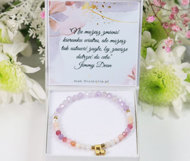 Kompozycja kolorowych kamieni naturalnym w odcieniach różu i fioletu, na nutce możemy wykonać krótki grawerunek.