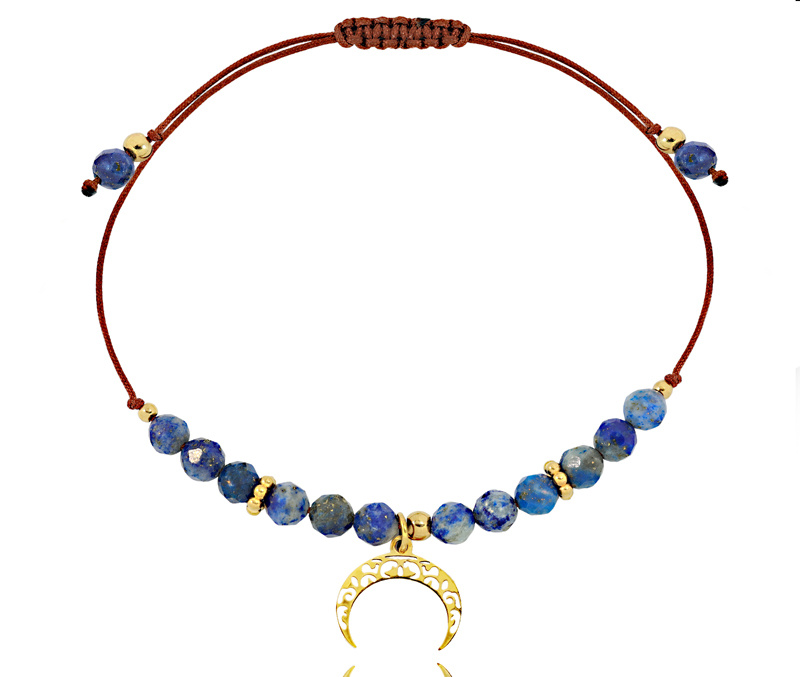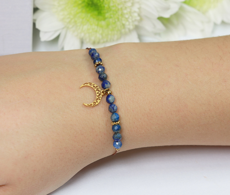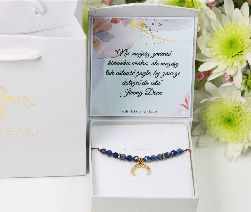 Przedstawiona bransoletka to niezwykle delikatny i stylowy dodatek, który łączy w sobie piękno naturalnych kamieni z subtelnym akcentem w postaci złotej zawieszki. Głównym elementem bransoletki są koraliki wykonane z lapis lazuli - kamienia szlachetnego o intensywnym niebieskim kolorze, często porównywanym do nocnego nieba. Lapis lazuli od wieków był ceniony za swoje właściwości lecznicze i magiczne. Złota zawieszka w kształcie półksiężyca dodaje bransoletce subtelnego uroku i tajemniczości. Księżyc od zawsze był symbolem kobiecości, intuicji i cykliczności życia.