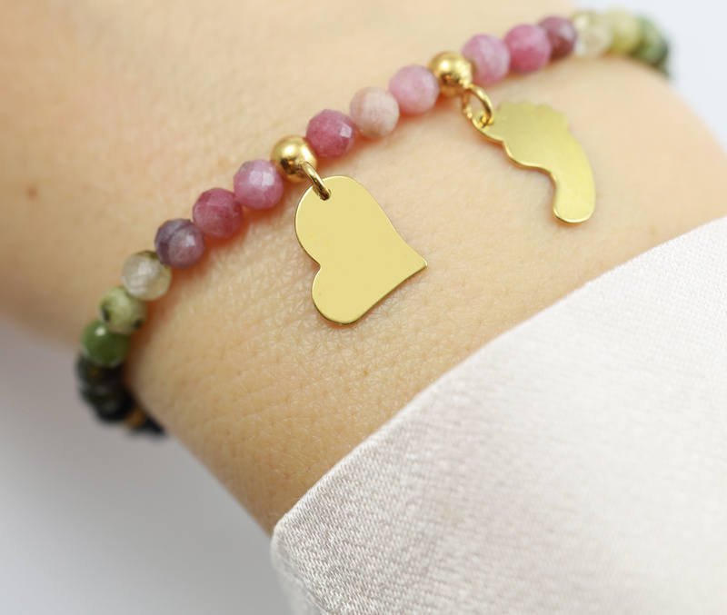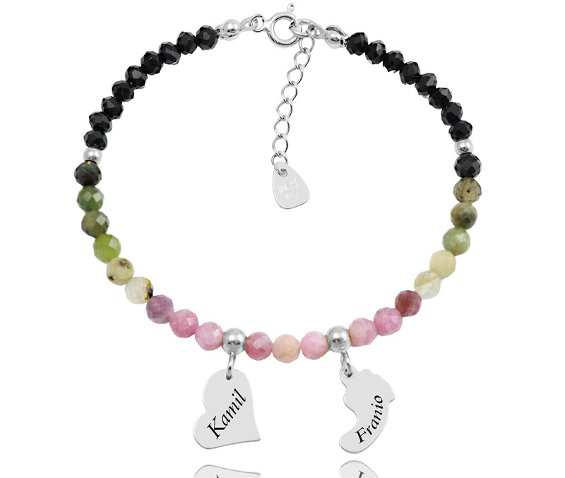 1734/4 zielono-różowa bransoletka srebrna 925 z grawerem i turmalinem